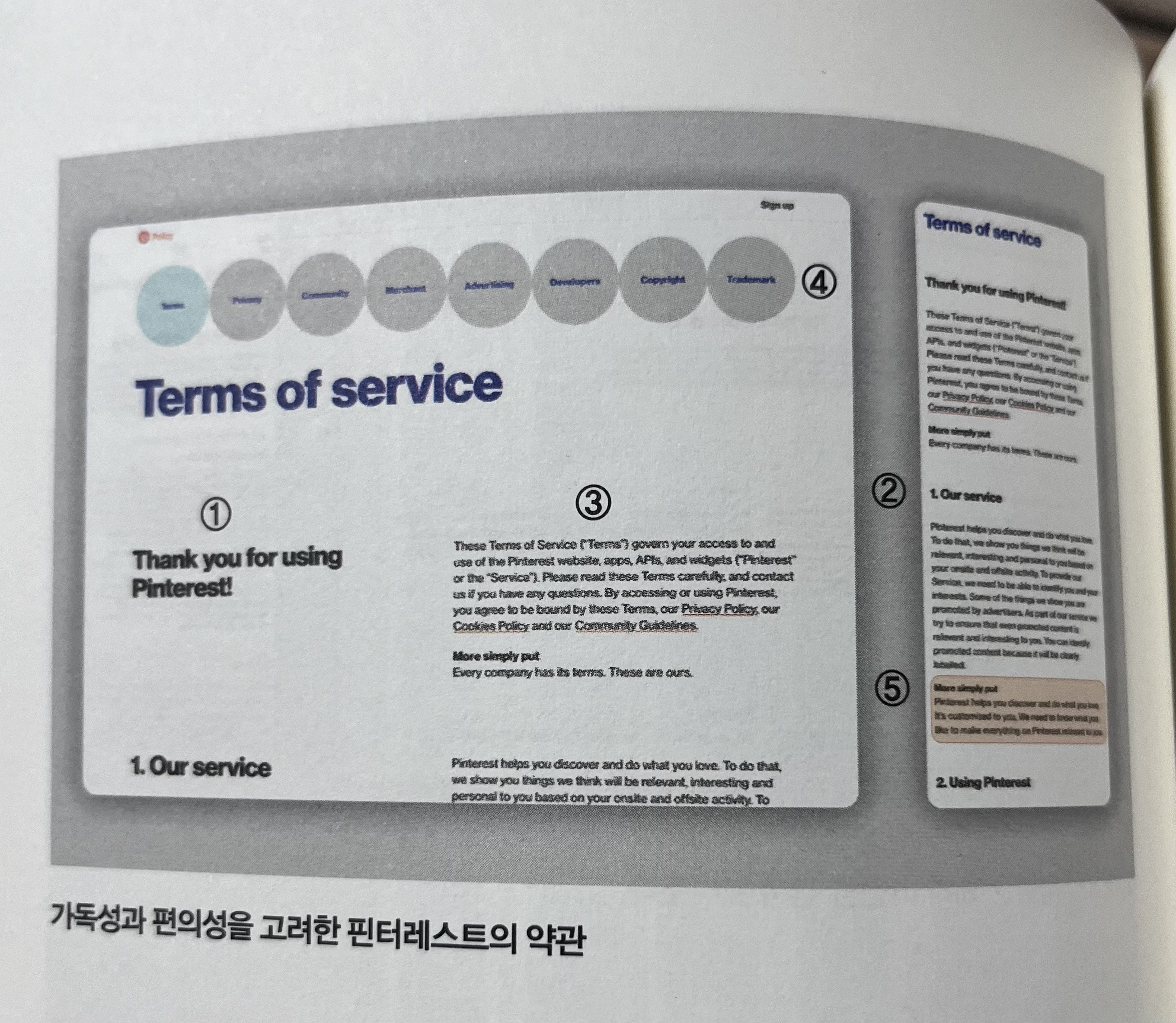 물론 그렇지 않은 약관에 대해서도 몇 가지 나왔는데 그 중에서도 핀터레스트 약관이다. 논리적으로 이 UI가 어떻게 사람들에게 더 다가가기 쉬운지 설명이 잘 나와있어서 좋았다. 궁금한 사람들은 직접 책을 찾아보면 도움이 많이 될 거 같다.